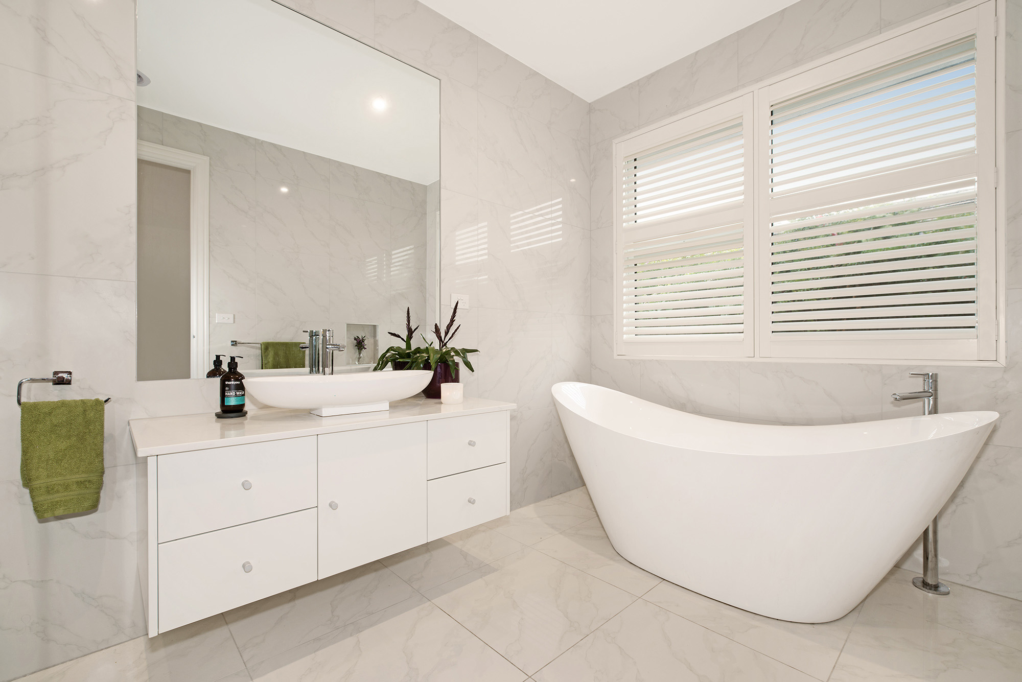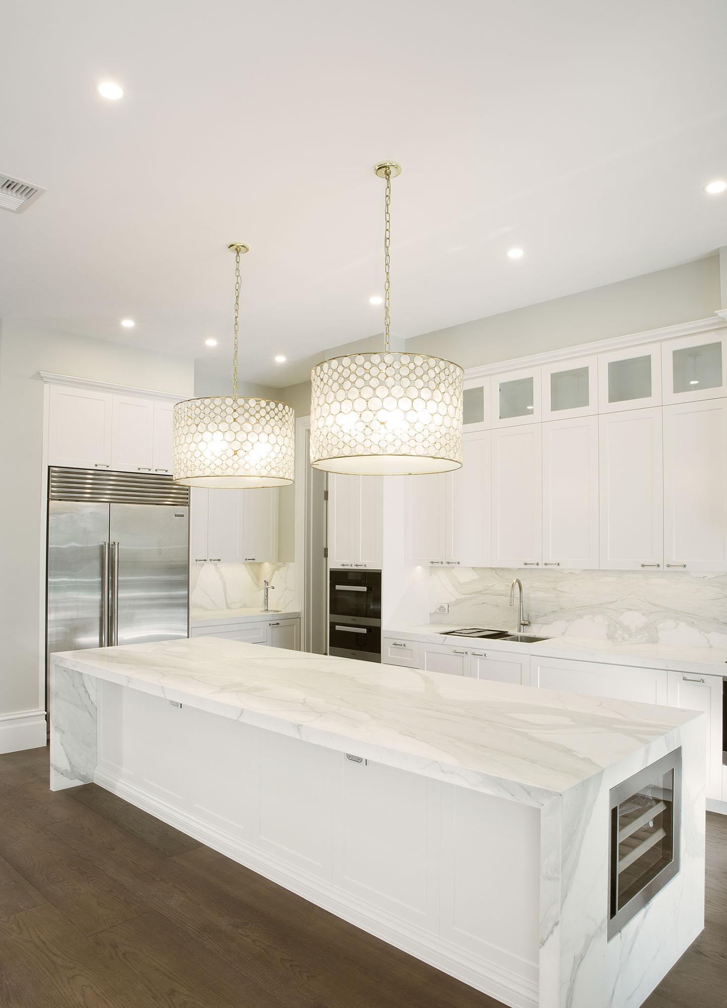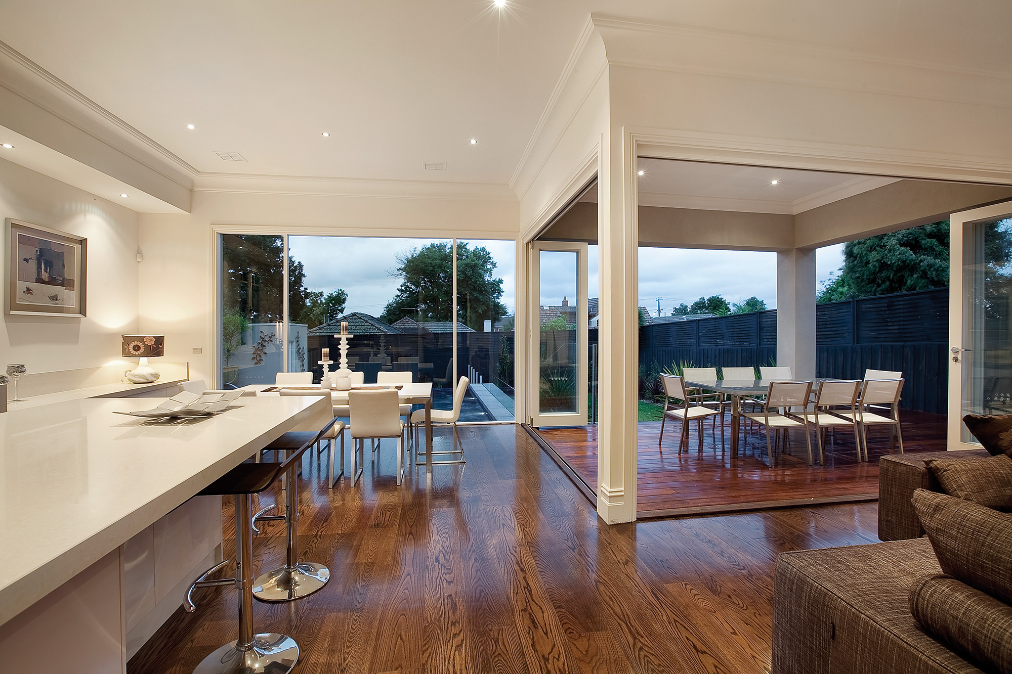 The internal finishes of this home include the American oak timber floors and travertine-style tiles in the stunning entrance hallway. The oversized skirting boards and soaring ceilings help emphasise the abundance of natural light within the home.