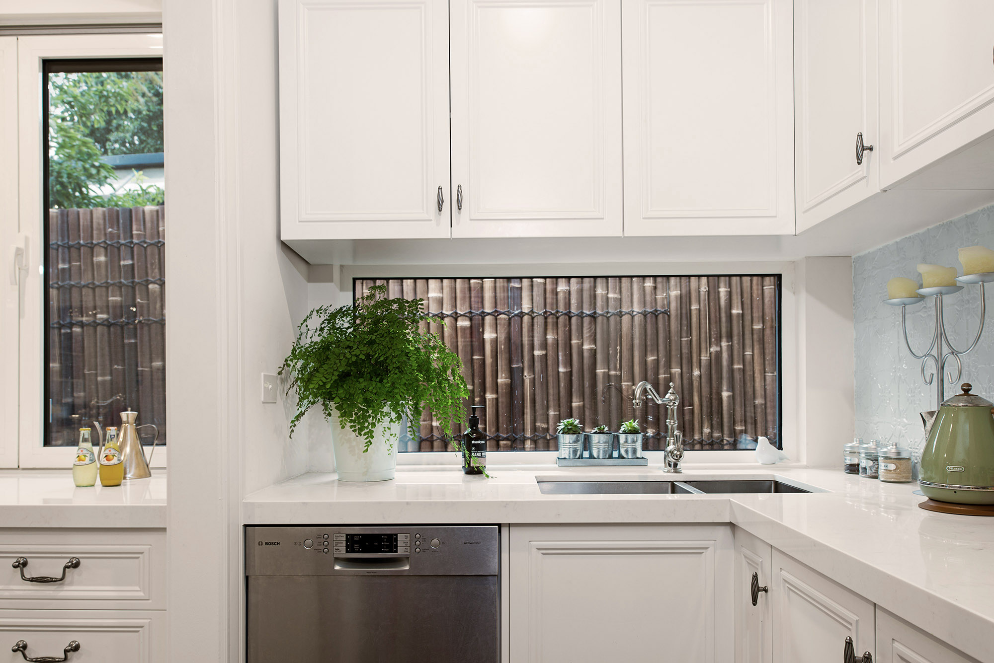 The home includes several energy- and water-saving features, with solar panels, double-glazed windows and rainwater tanks that service the drip irrigation and household sanitation. As you move outside, the landscaping of the home includes a mixture of native and edible plants, as well as bamboo cladding on the north-side to act as a fence around the deck.
